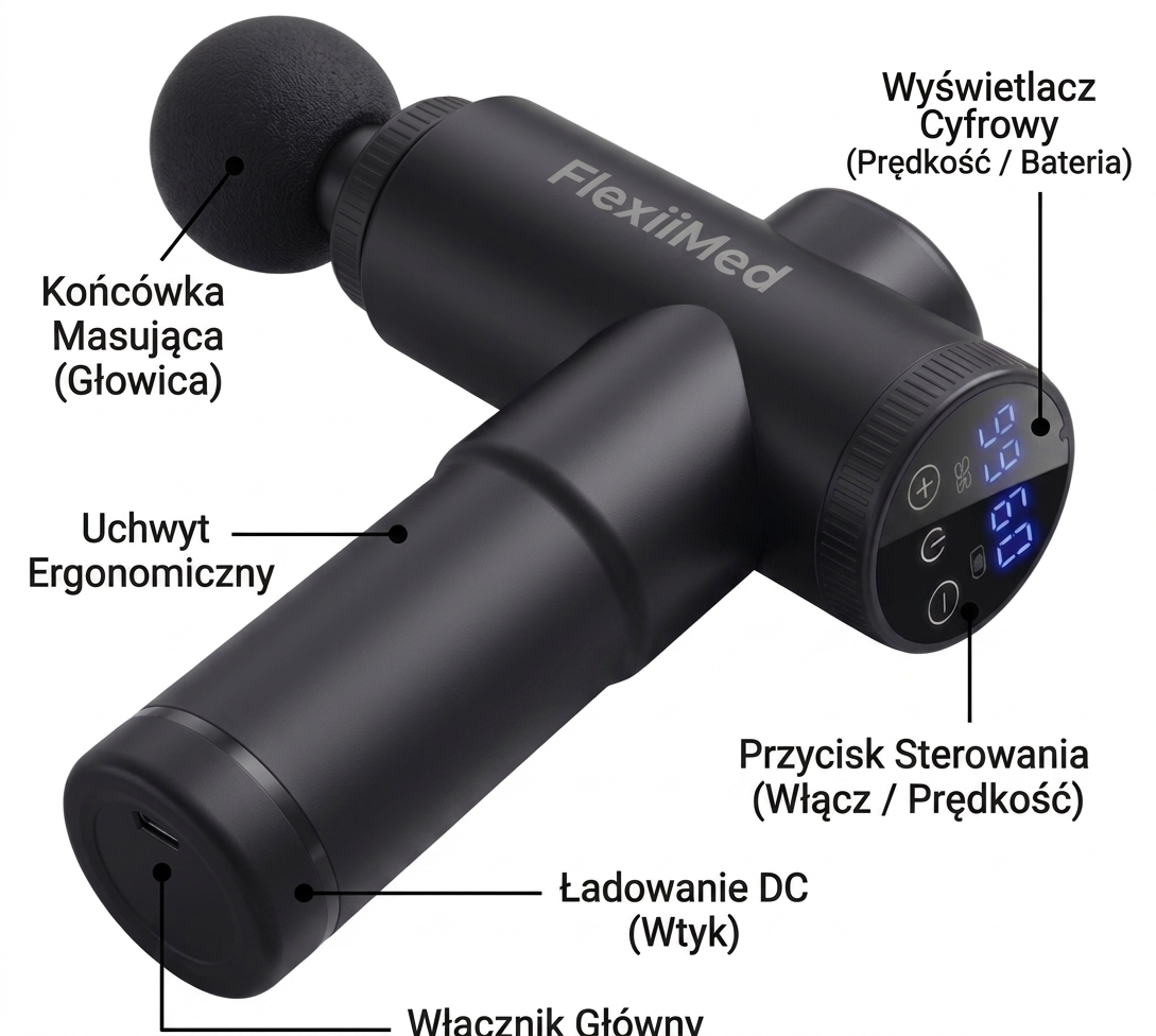 Wkrocz do świata elastyczności i siły z FlexiiMed Power Pro – pistoletem do masażu, który wyznacza standardy profesjonalnej regeneracji. Zaprojektowany z myślą o najbardziej wymagających użytkownikach, wykorzystuje moc precyzyjnych, dynamicznych wibracji, aby przynieść Ci natychmiastową ulgę i głęboki relaks. To nie jest zwykły masażer; to Twój osobisty klucz do odzyskania pełnej sprawności.