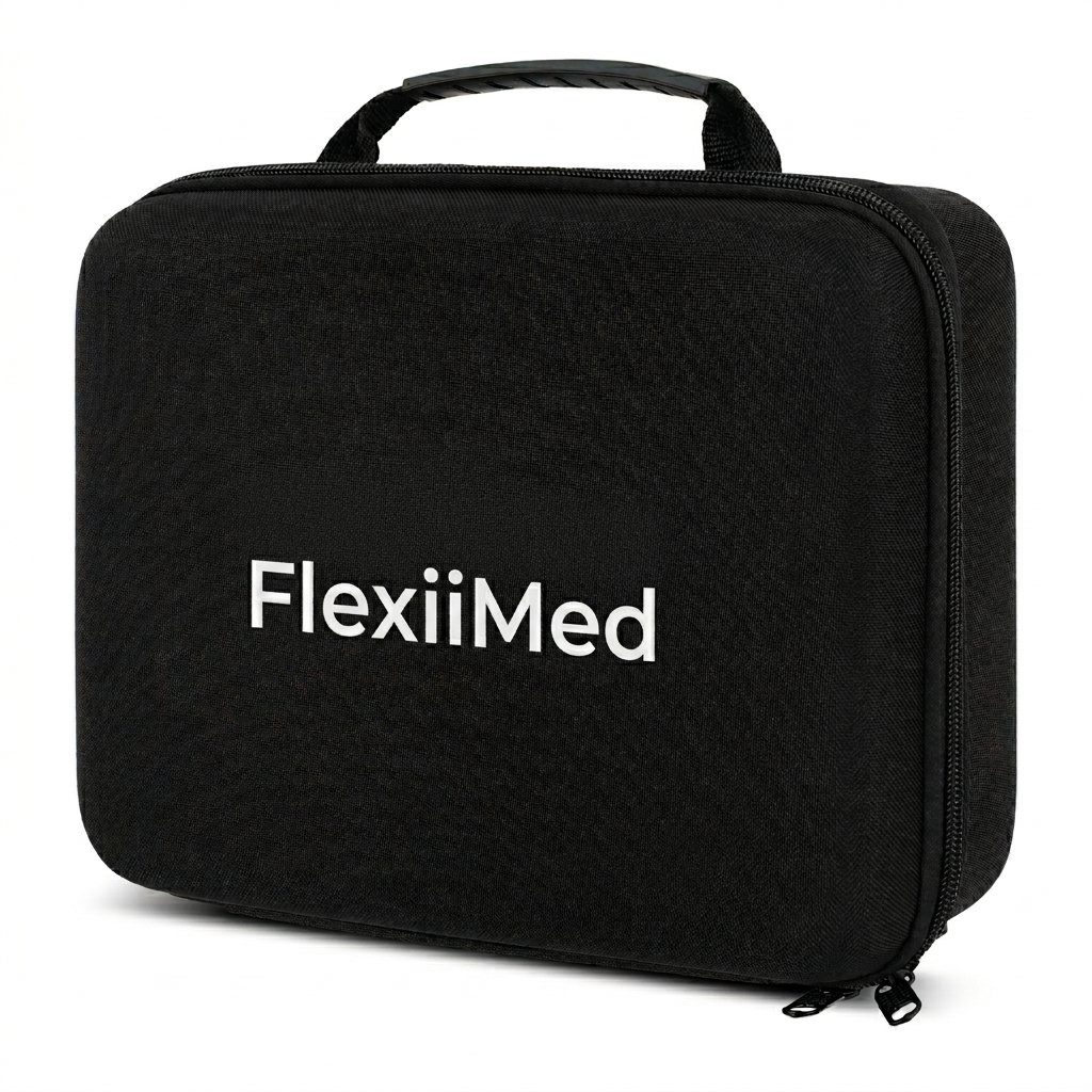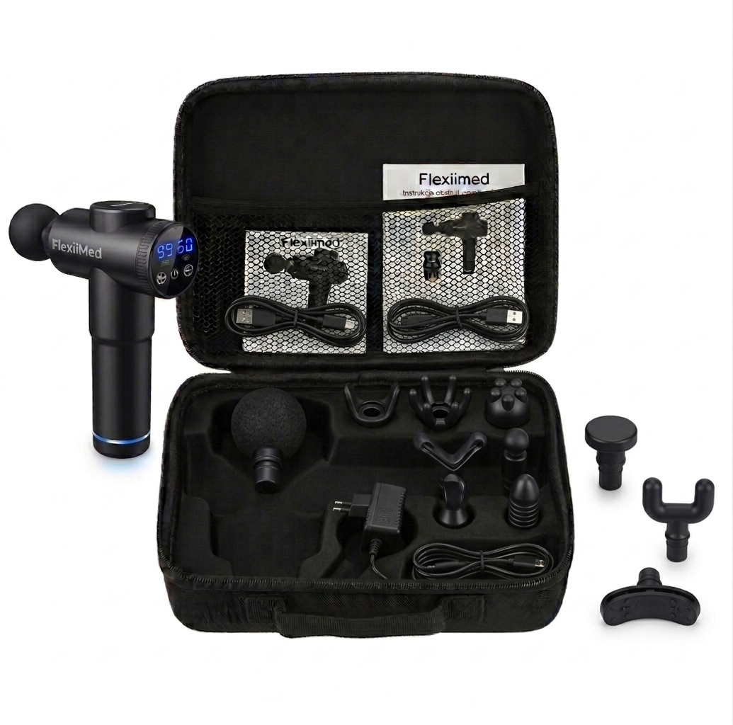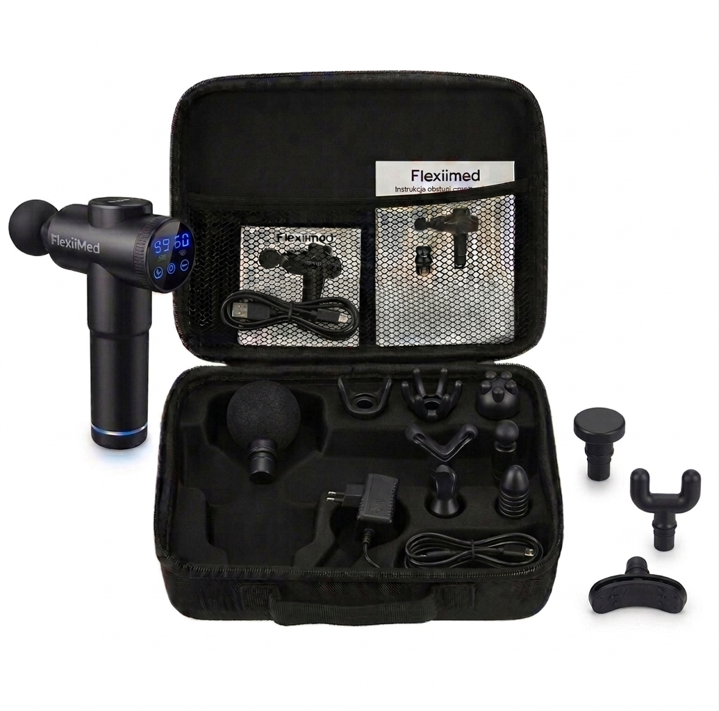 FlexiiMed dostarczamy w usztywnianym kuferku, który łączy styl z maksymalną ochroną. Specjalnie wyprofilowane wnętrze pomieści masażer, wszystkie końcówki oraz zasilacz, a dodatkowa siatka zabezpieczy drobne akcesoria. Wytrzymała konstrukcja chroni sprzęt przed uderzeniami w trakcie transportu.